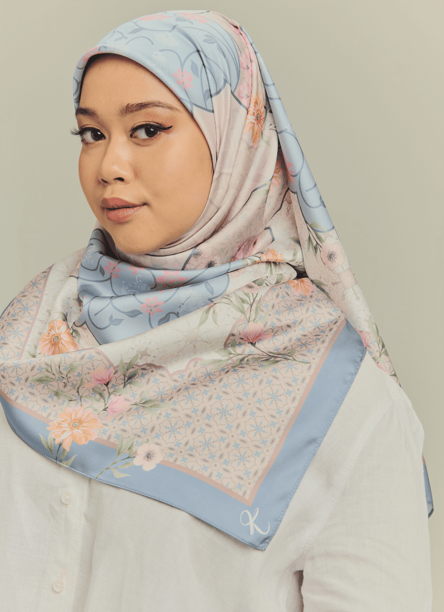 The Ameena Hijab is inspired by the civilization of Islam in the modern world. It is designed with soft pastel flowers, Islamic abstract and an outline of the city. The hijab is designed with the KHATREENA monogram positioned within the pattern which sets to put KHATREENA in the eyes of the world.