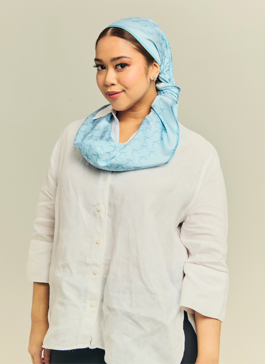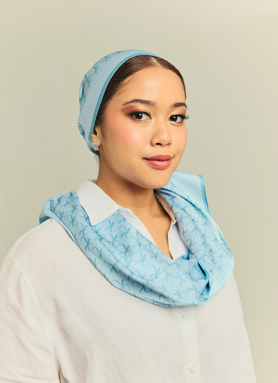The Maldives Blue Monogram Hijab is part of KHATREENA’s iconic signature square scarf collection.
