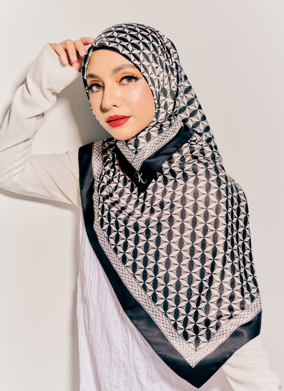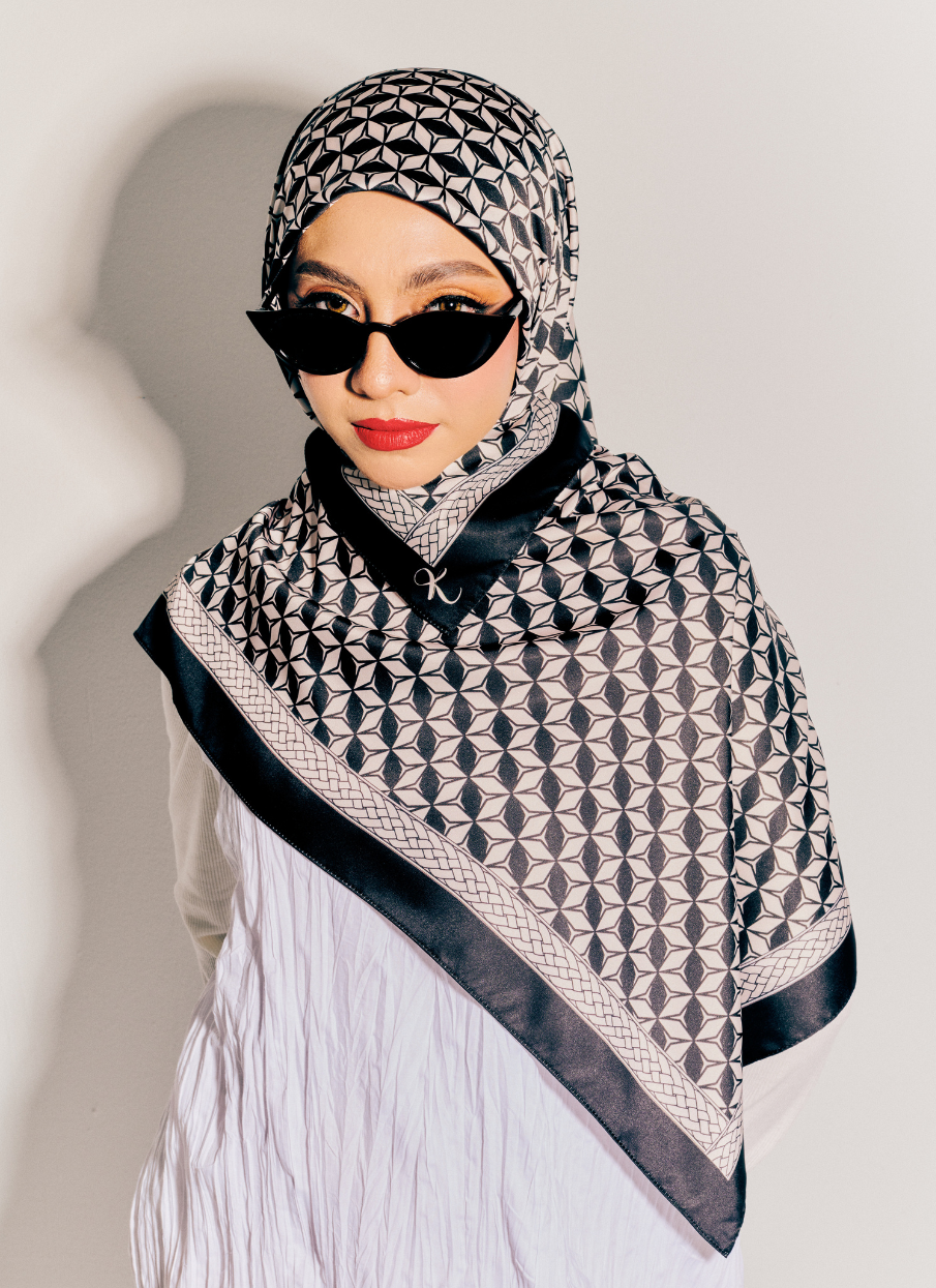 Safeeya Hijab combines classic black and white tones with elegant geometric prints. This best-seller enhances any outfit with a bold yet sophisticated touch.